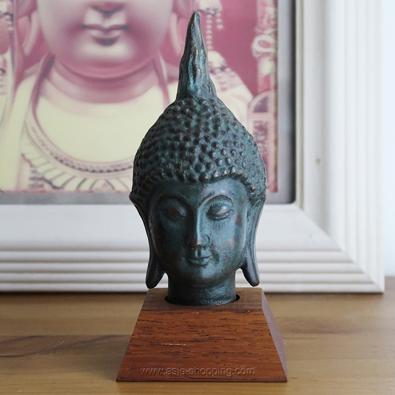 Tête de Bouddha en bronze sur un socle en bois massif.